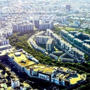 Mảng xanh: Công viên nội khu rộng lớn, đường dạo bộ xanh mát và các hồ sinh thái xen kẽ các tháp căn hộ.