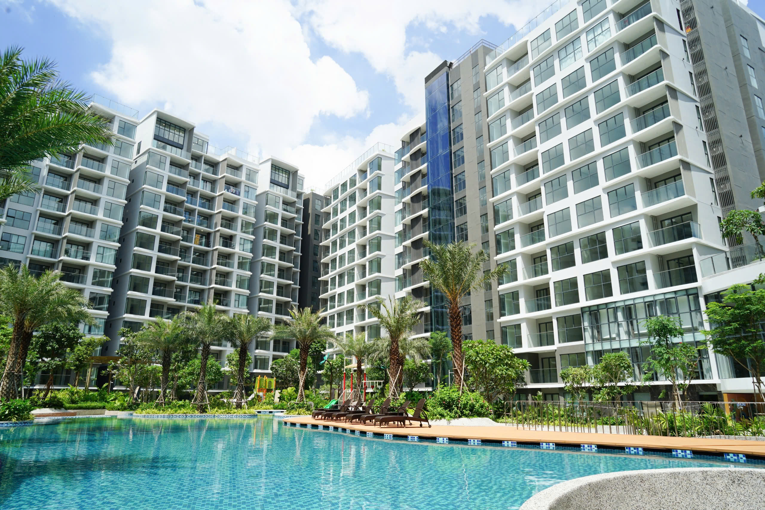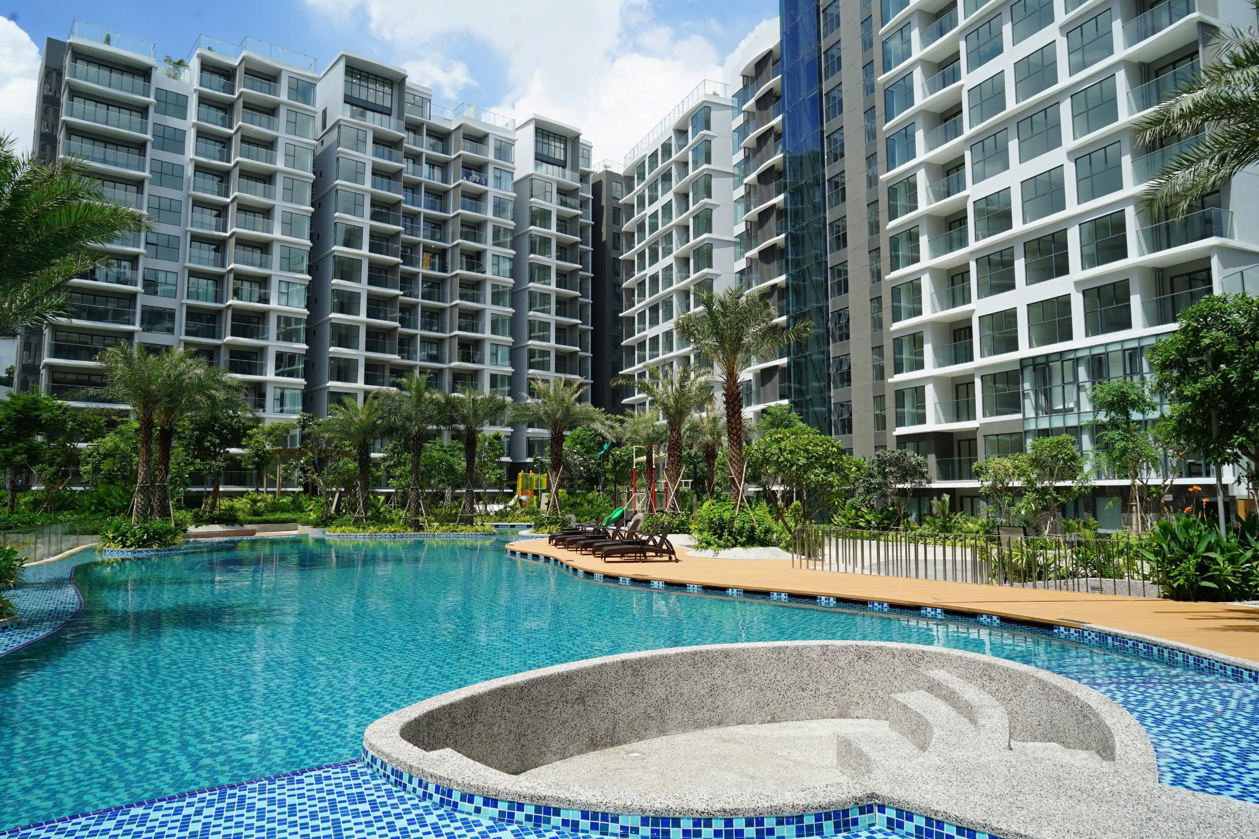Bãi biển nhân tạo: Hồ bơi tràn bờ kết hợp cát trắng và hàng dừa nhiệt đới.